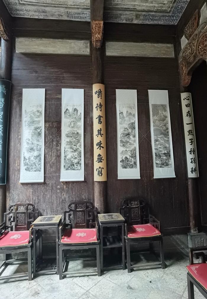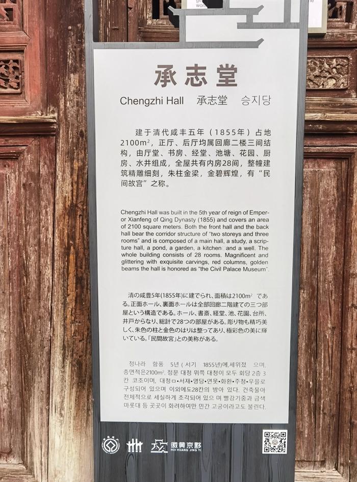 再去看看承志堂。承志堂建成于清咸丰五年(1855年),是清末宏村大盐商汪定贵的住宅,整幢建筑精雕细刻、朱柱金梁,有“民间故宫”之称。承志堂的建筑为砖木结构,有136根柱,60道门,60扇窗,寓意六六大顺。承志堂有9个天井,7座楼阁,前后两进,以中门、前后正厅堂为中轴线,南北纵深一进庭院,二进厅堂,东西两侧对称布局。总占地面积约2100平方米,建筑面积3000余平方米,是一幢保存完整的大型民居建筑,现为安徽省重点文物保护单位。