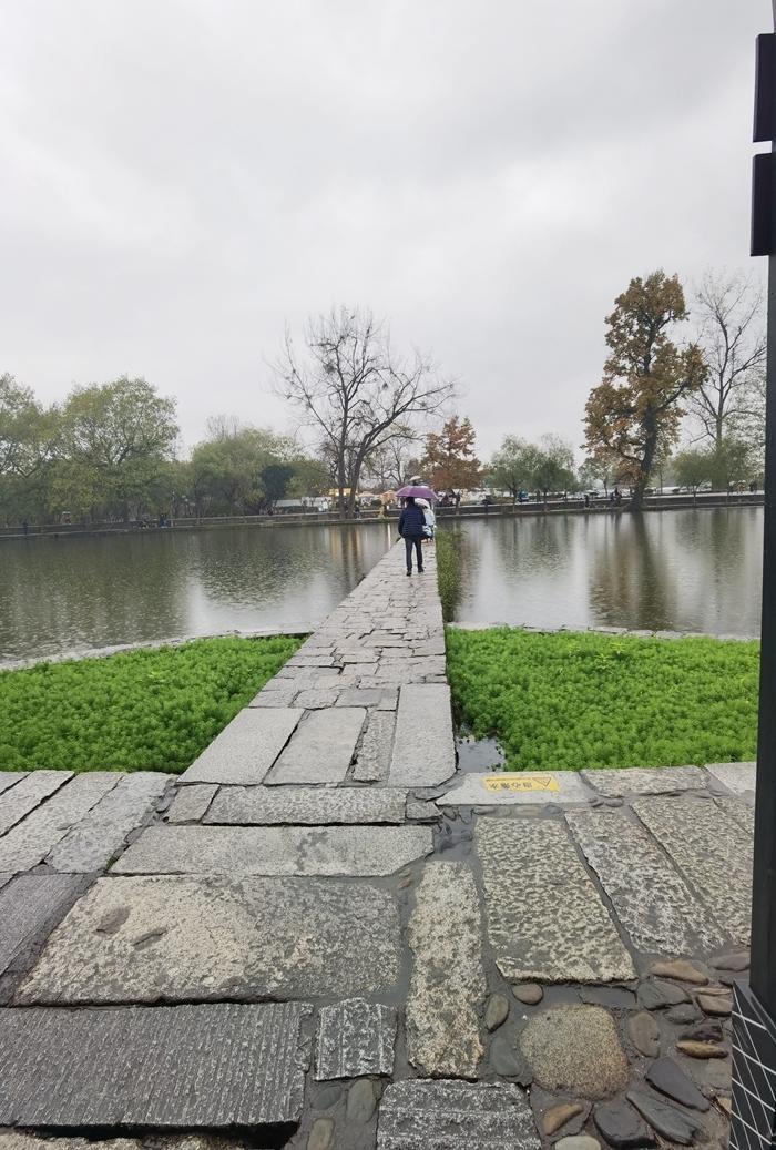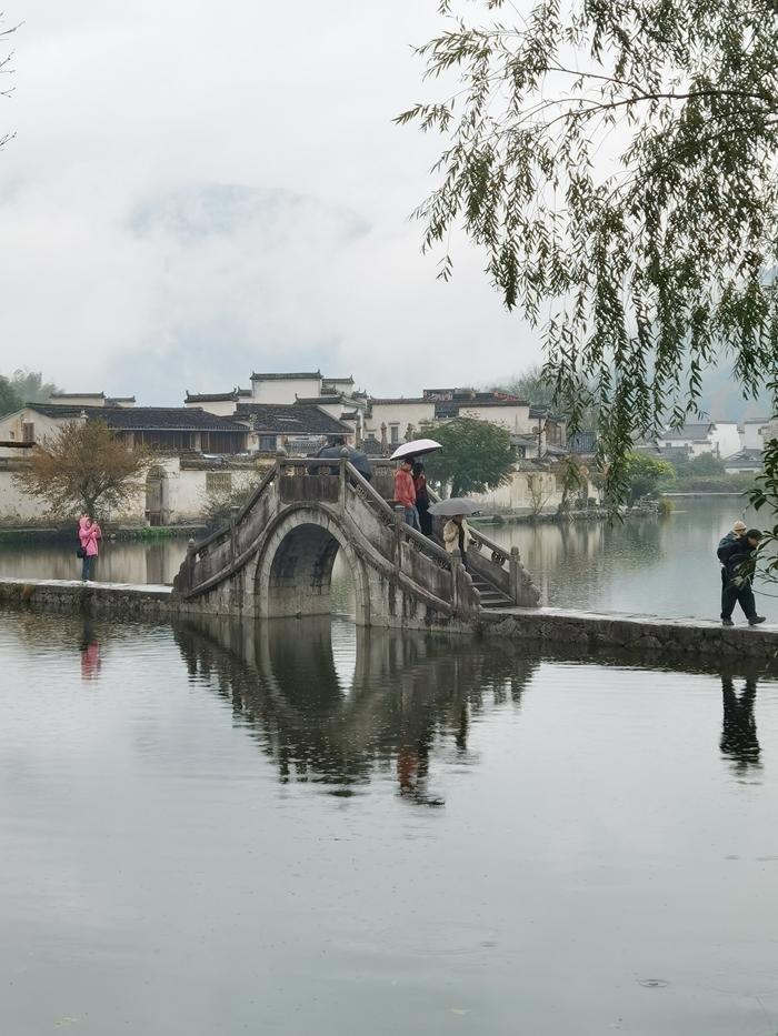 进了大门再往里走,就是一个大大的湖泊,叫南湖。南湖边是宏村的摄影区,这里有明净的湖面,湖岸边的垂柳,湖心的拱桥,湖对岸的徽派美宅,这些都可以做拍照的题材。南湖在牛形村中相当于牛肚子。