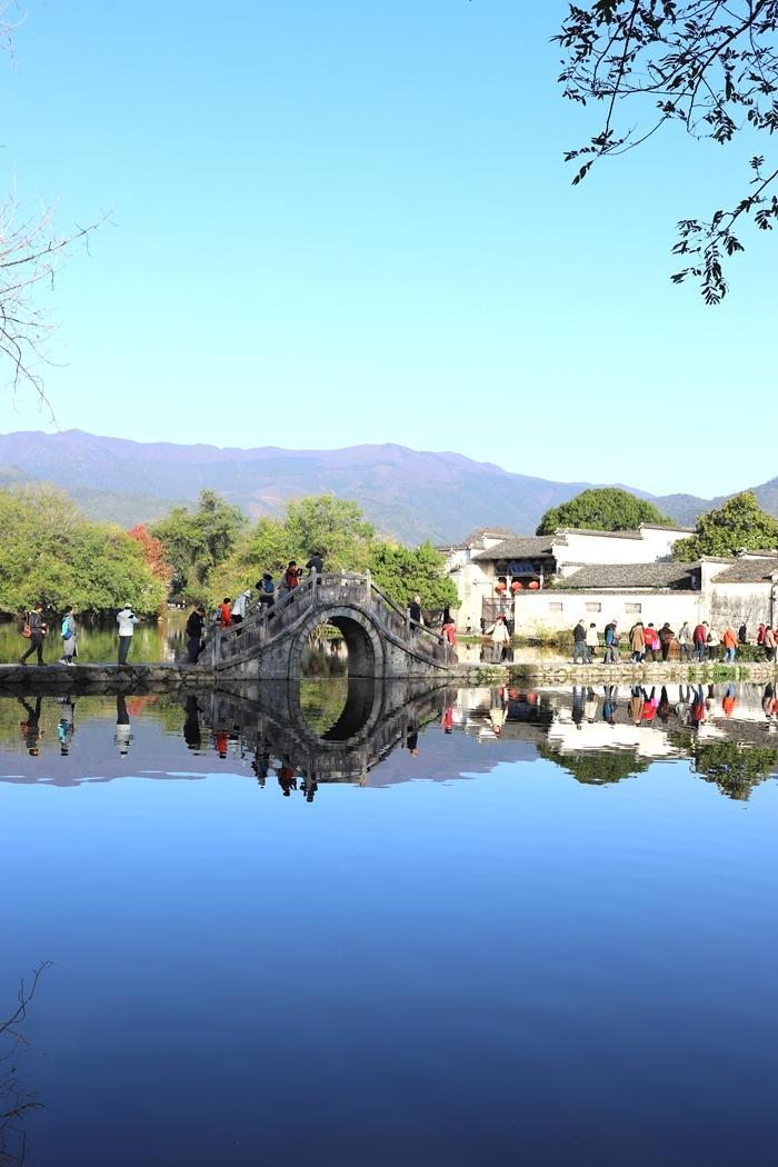 在此位置,要进村,就要过一个拱桥,这个拱桥叫画桥。画桥始建于清朝,后来历经风霜损毁了。1986年,画桥得到了重建。画桥现在是宏村的标志性建筑,这里也是拍电影《藏龙卧虎》的取景地。现在成为游客的网红打卡地。