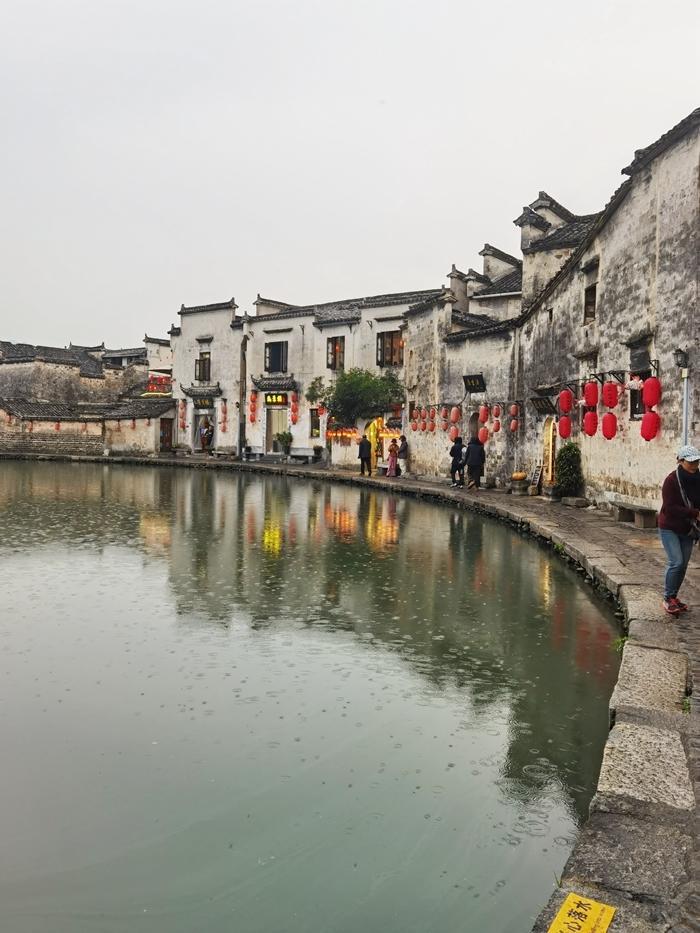 我来到了宏村的核心景点月沼。月沼,又称月塘,位于宏村中心部位,建于明永乐年间。当时宏村人汪思齐三次聘请海阳县(今休宁)的风水先生何可达,并族内高辈能人,“遍阅山川,详审脉络”,制订扩大宏村基址及村落,全面规划牛形水系蓝图,引西溪水绕村屋,其牛肠水圳九曲十弯,又把水引入村中心天然井泉处建月沼池塘,以蓄条内阳水,供防火、饮用等。后经再次凿圳、挖掘成半月形池塘,形成了“月沼”。月沼相当于牛形村的牛胃。