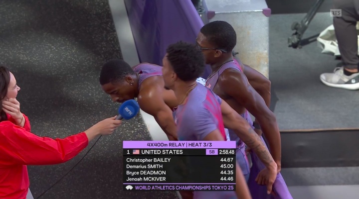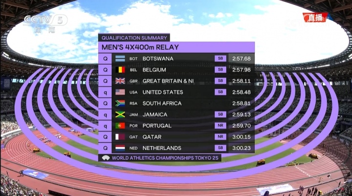 这场比赛是在之前的晚场进行的,男子4×400米接力,美国队本来的成绩是3分01秒06排在了小组第六,已经进不了决赛了。进决赛的8个队是博茨瓦纳、比利时、英国、南非、牙买加、葡萄牙、卡塔尔和荷兰。