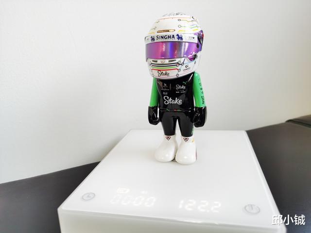 好了有些扯远了,回到这款赛车人偶本身,高度为11厘米,Q版大头的设计有点头重脚轻,在沙发上还放不稳。正好手头有个电子秤,顺便称一下重量,122.2克也不是很重。