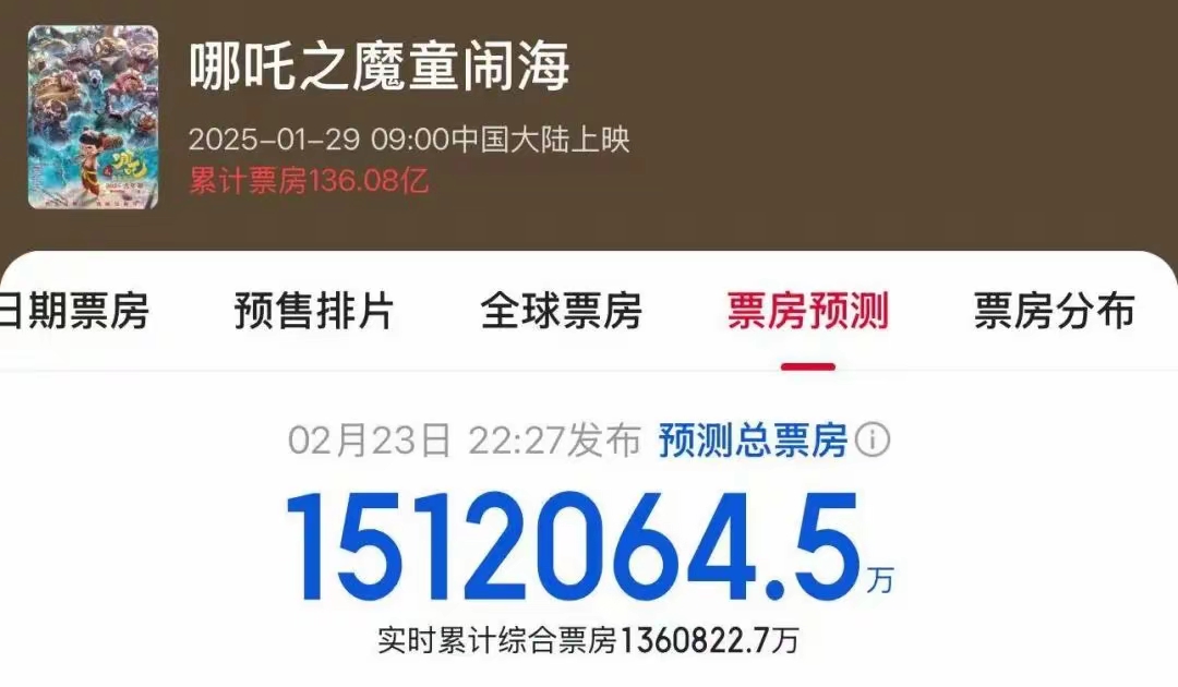 家人们,最近电影圈那可是炸开了锅!《哪吒2》宛如一颗耀眼的流星划过影视天空,票房成绩那叫一个震撼。才短短2天就狂揽8.7亿元,直接突破137亿元大关,预测票房更是直奔160亿元而去,这数据简直能闪瞎人的眼。就连人工智能DeepSeek都懵了,直呼票房高到难以置信。可就在这一片火热的票房景象背后,光线传媒的股价却不涨反跌,这到底是怎么回事呢?今天咱就来好好扒一扒。