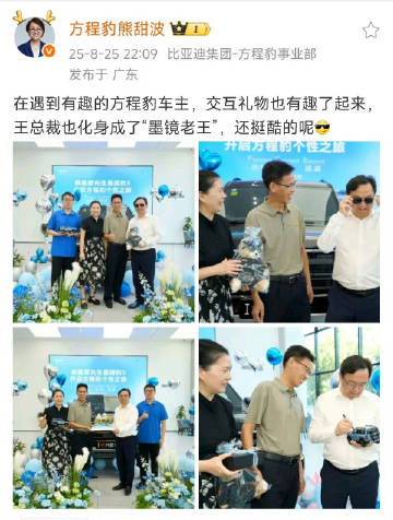 最近,比亚迪总裁王传福带领集团高管奔赴河南、湖北,亲自为方程豹车主交车,还与车主面对面交流,看得出比亚迪对方程豹这个高端品牌以及用户体验有多重视。现场氛围特别融洽,一位警官学院的老师车主,特意送了副墨镜给王传福,王总当场戴上和车主全家合影这种没有距离感的交付,相信也拉进了用户和企业之间的距离。