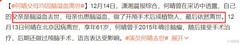 值得一提的是,何晴曾在采访中透露,父亲和母亲也都是因脑溢血而去世。父亲脑溢血去世后,母亲也罹患脑溢血,做了开颅手术后成了植物人,最后依然离世。想不到的是,何晴如今也因脑部疾病而离世。
