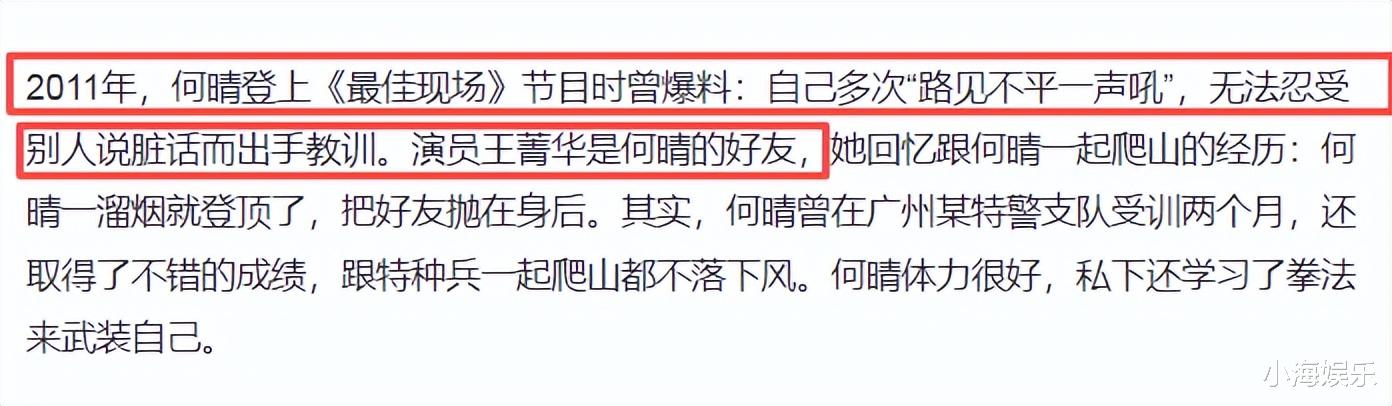 何晴对人友善,鲜少发脾气。但是面对一些不平事,她也会“路见不平一声吼”,当年何晴在节目中曾自爆,自己因忍受不了对方说脏话,而出手教训。而何晴也是一位练家子,演员王菁透露,和何晴一起爬山,何晴一溜烟就登顶了,据说何晴在特警队训练过,还学了拳。