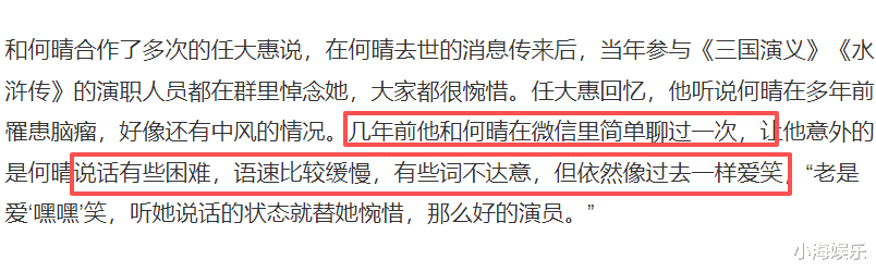 94版《三国演义》和98版《水浒传》的总制片人任大惠回忆,在几年前,听说何晴罹患脑瘤,有中风的情况,于是和何晴聊过一次。让自己意外的是,何晴说话困难,语速缓慢,有些词不达意,但依然像过去一样爱笑。总是嘿嘿地笑。可见何晴面对病魔是如此乐观。