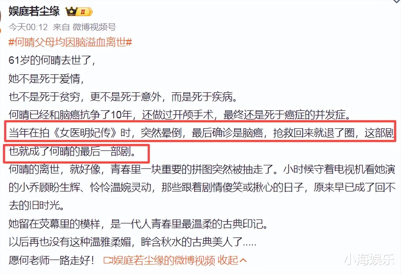 有博主称,何晴当年在拍摄《女医明妃传》的时候,就突然晕倒,最终确诊是脑癌,抢救回来后就退了圈。而这部戏也成了她最后一部戏。而在和脑癌抗争的这10年间,还做了开颅手术,然而最终还是没有逃脱病魔。