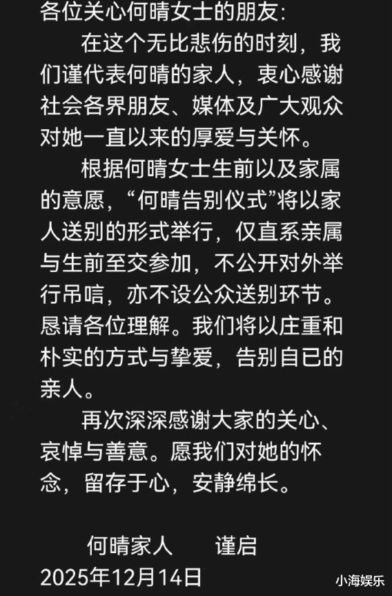在这份谨启中,何晴家人首先对所有关心何晴的媒体,观众表达了感谢。随后,称根据何晴生前及家属的意愿,何晴的告别仪式以家人送别的形式举行,仅直系亲属,以及生前至交参加。不对外举行吊唁,不设公众送别环节。