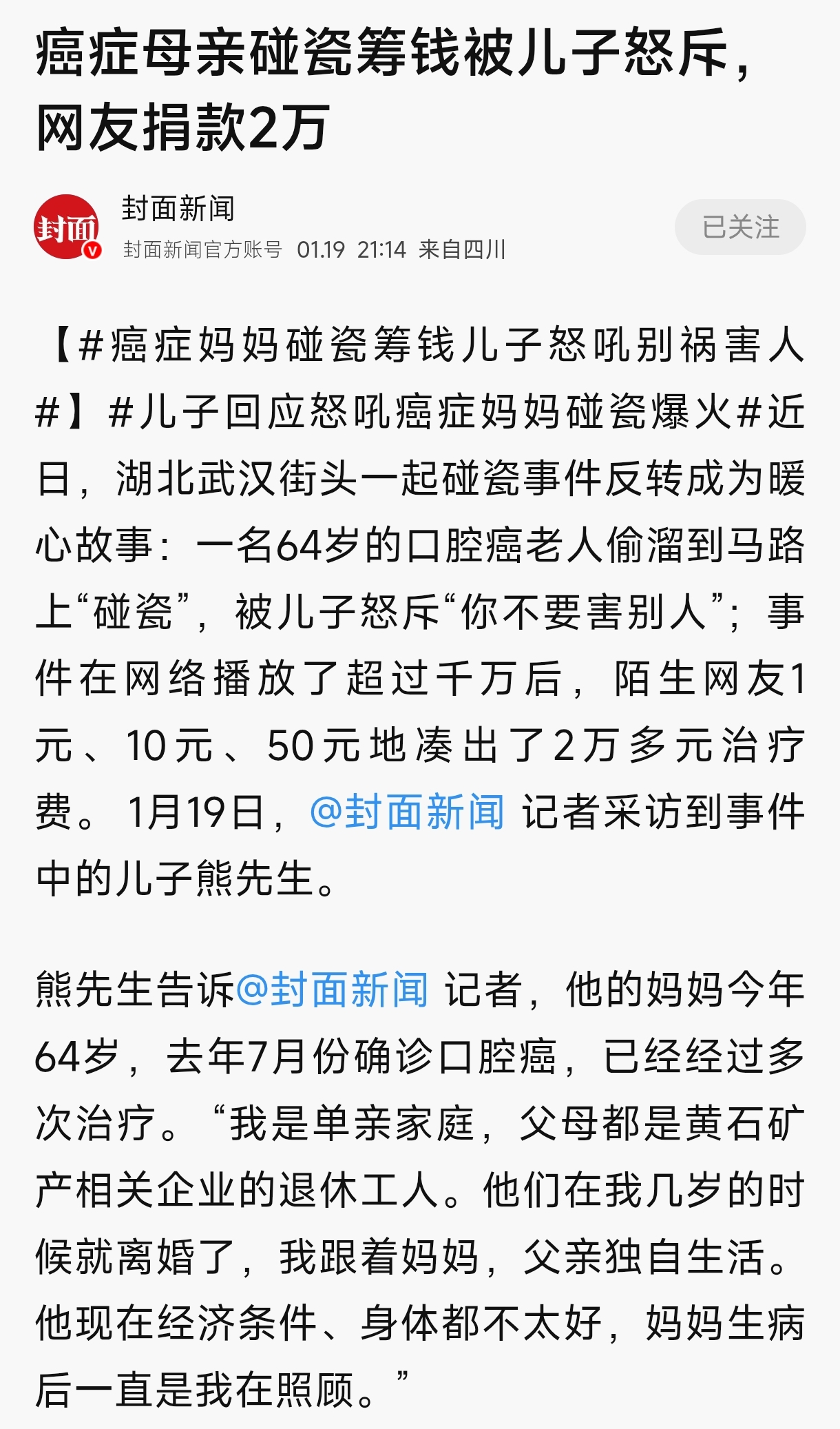而网友的反应,也出人意料。他们没因为“碰瓷”就骂人,也没因为“癌症”就无脑同情。他们看到了一个更复杂的人间:一个做错事的老人,一个坚守底线的儿子,一个被疾病压垮的家庭。然后,他们选择了用善意回应。不是施舍,更像是一种“看见”——看见困境,也看见底线。
