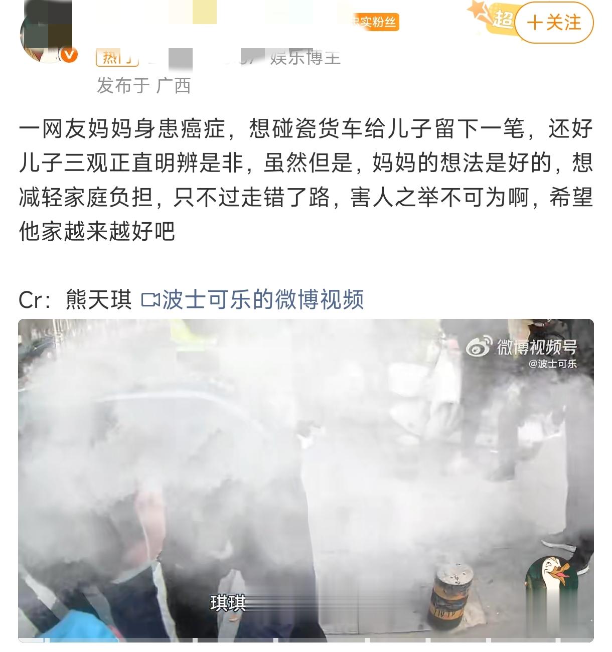 这话听着让人心酸。一个癌症晚期患者,为了治病钱,动了碰瓷的念头。但熊先生没惯着。他把视频发到网上,不是博同情,是想让更多人看到后躲着点——“我怕她下次还这样。”他说这话的时候,语气里全是无奈。