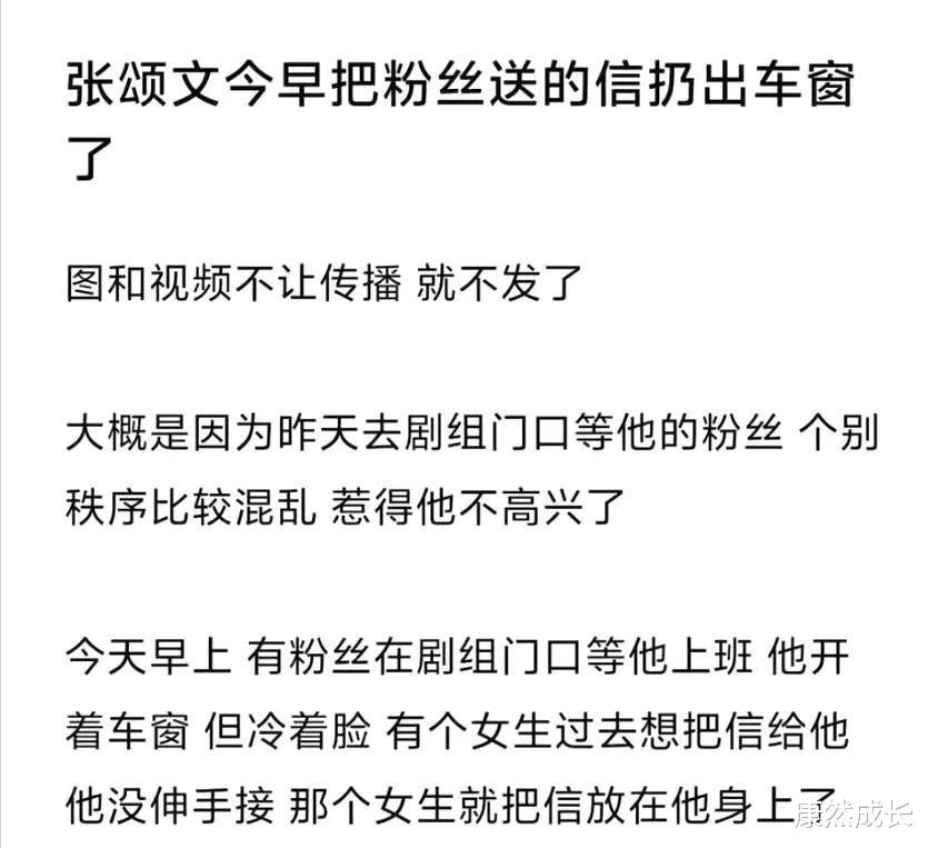 事情的起因很简单:张颂文老师在结束一天的工作后,乘车离开,一位粉丝试图递交一封信表达自己的支持。然而,令人意外的是,张颂文老师并没有收下这封信,而是直接把它扔出了车窗外。这一幕被路人拍下并上传网络,迅速引发了热议。这看似简单的一件事,却牵扯出了复杂的网络舆论战。
