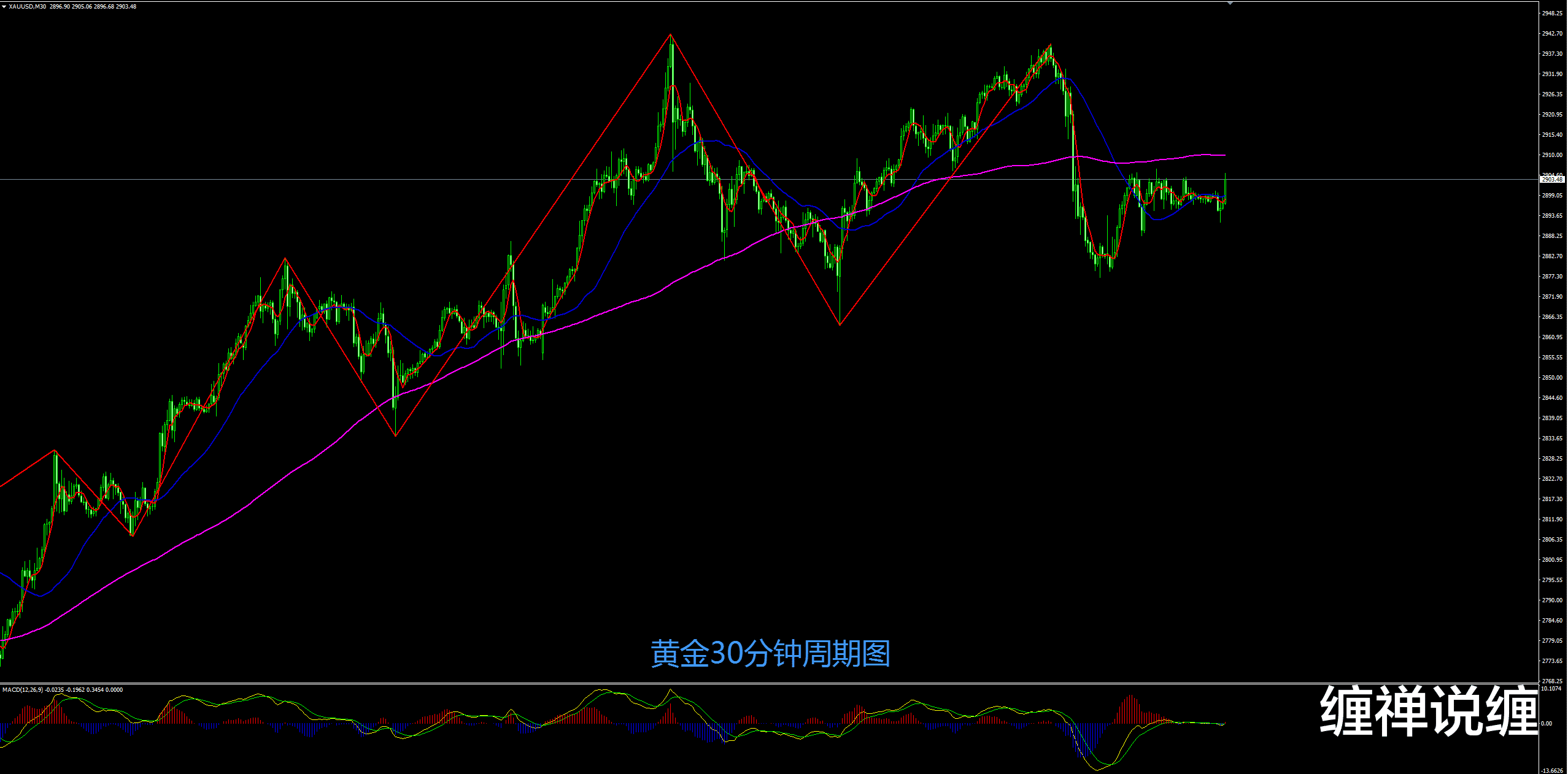 黄金30分钟现在是横盘震荡,黄金如果不再跌破2876,那么黄金30分钟可能反弹延续,如果黄金最终选择向上突破2907,那么黄金短线反弹有望延续。黄金早盘短线反弹遇阻,可以继续空,如果黄金跌破2888,那么黄金短线弱势有望延续。黄金震荡反弹遇阻,短线2904继续空!