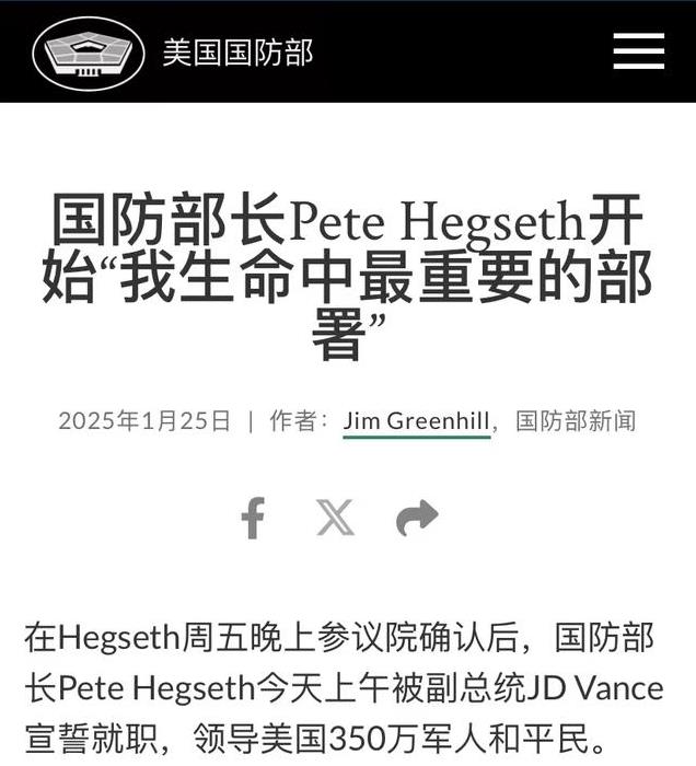 1月25日,在前一天获得参议院微弱优势确认后,海格塞斯在副总统万斯的主持下宣誓就任美国新防长。