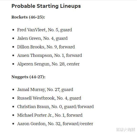 再看预计的掘金队首发阵容。掘金队的双后卫是贾马尔・穆雷和威斯布鲁克,两位前锋是布劳恩和小迈克尔・波特,而他们的中锋则由阿隆・戈登客串。可以说,虽然少了约基奇的内线高度,但掘金队这套阵容的运动能力非常强。不管是威斯布鲁克还是阿隆・戈登,都是能跑能跳的猛将。火箭队对阵这种冲击力极强的阵容,不一定能占到上风。