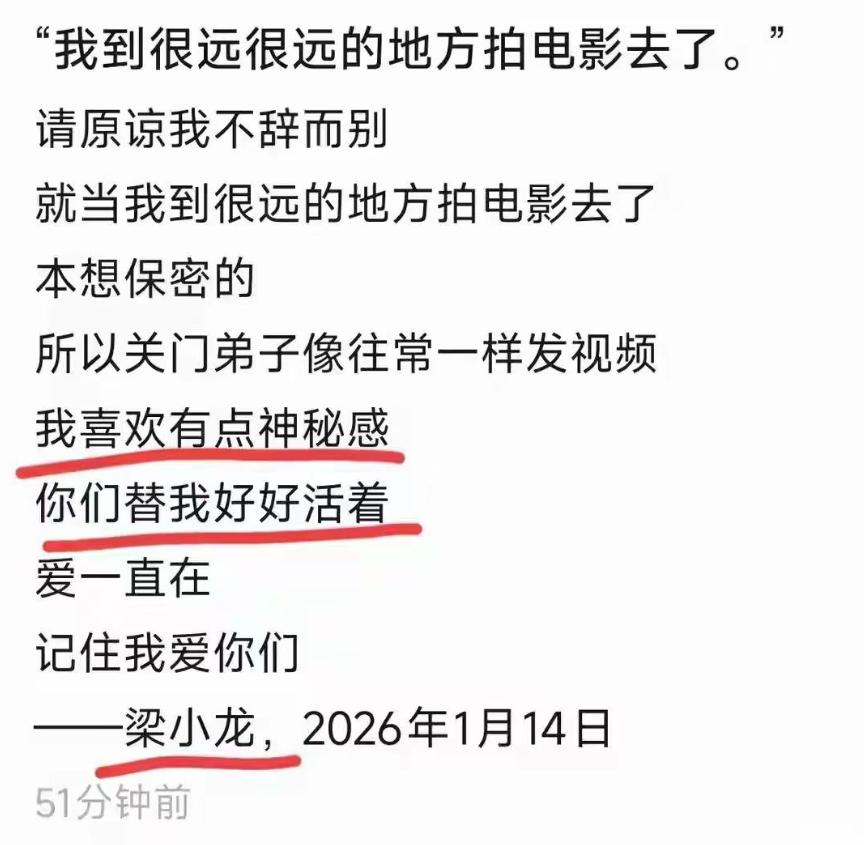1月18日晚,梁小龙的家属通过他的社交账号发布了告别文,以他的口吻写道:“我到很远很远的地方拍电影去了,请原谅我不辞而别。本想保密的,所以关门弟子像往常一样发视频。我喜欢有点神秘感,你们替我好好活着,爱一直在,记住我爱你们。”