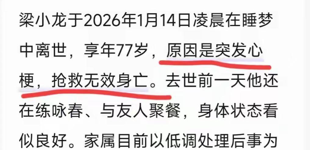 据家属透露,梁小龙去世前一天状态很好,1月13日白天还和友人在深圳罗湖的火锅店吃羊肉火锅,谈吐爽朗。