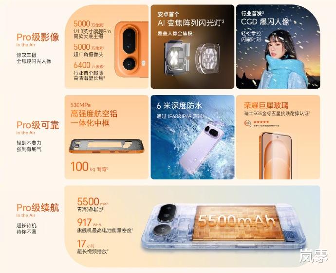 作为轻薄旗舰手机,荣耀 Magic8 Pro Air 的Pro级别的影像,搭载了 5000 万像素主摄镜头、5000 万像素广角摄像头、6400 万像素潜望式长焦摄像;续航上电池虽然有所缩水,但保留了无线充电,装下了 5500mAh 青海湖电池,能量密度高达 917Wh/L,支持 80W 有线快充、50W 无线快充。