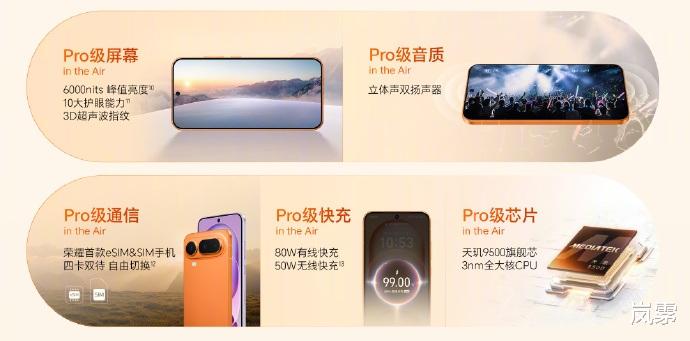 其他配置方面,该机搭载立体声双扬声器、天玑 9500 旗舰芯、防尘抗水(6 米 IP68、IP69),支持 SIM&eSIM 自由切换(四卡双待)。屏幕支持 6000nits HDR 峰值亮度、10 大荣耀绿洲护眼能力、3D 超声波指纹、支持NFC和红外遥控。