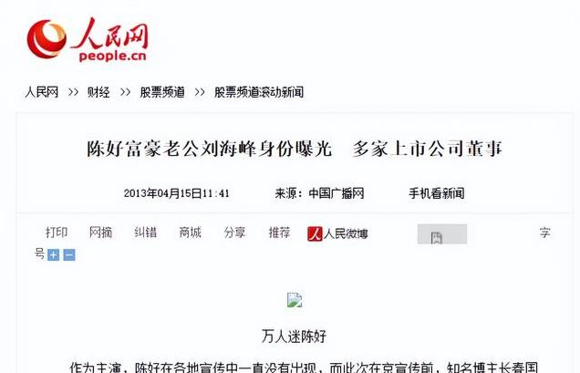陈好富豪老公刘海峰身份曝光 多家上市公司董事--财经--人民网