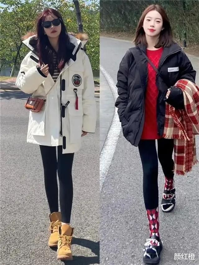这还是要看你的整体身材比例,如果是发福发胖,甚至是中年女性,这时候肯定无法穿无痕裤了,但是你的腿比较匀称,只是比别人稍微粗那么一点,这时候穿无痕裤也是没有任何问题,例如下面右边这位小个子女性用雾霾蓝的羽绒服搭配黑色无痕裤,呈现出来的效果,青春靓丽。