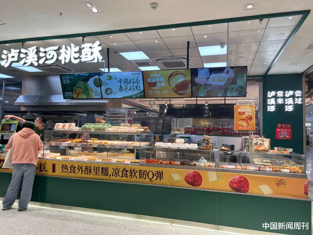 写满上述内容的标识,绕着一家“泸溪河桃酥”的橱柜贴了一整圈,收银台也被垒成一长条的黄油年糕盒围着。