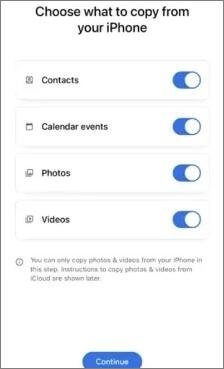 第 2 部分:如何通过“切换到Android将 iPhone 日历移动到AndroidGoogle 的“切换至Android应用(名为Android Switch”)现已在 Google Play 商店和 Apple App Store 上架,它简化了新Android用户的迁移流程。它允许您以无线方式传输消息、联系人、照片和日历。但是,此功能仅在Android设备的设置过程中有效。如果您已完成设置,请先将Android手机恢复出厂设置。另外,请务必备份重要数据。