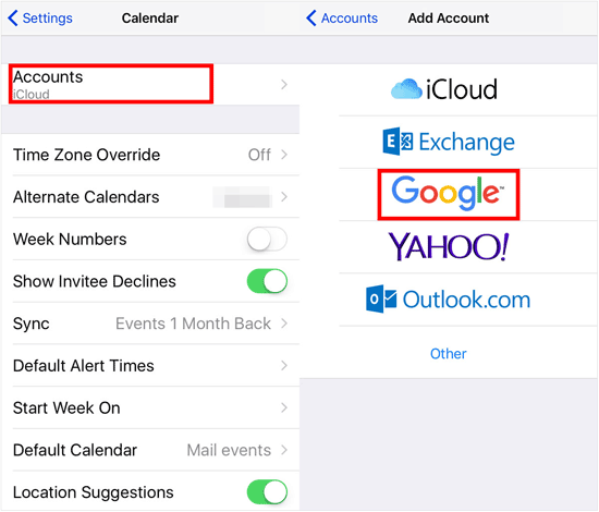 步骤 1:在 iPhone 上前往“设置”>“日历”>“帐户”,然后点击“添加帐户”>“Google”。然后使用您的 Google 帐户凭据登录。