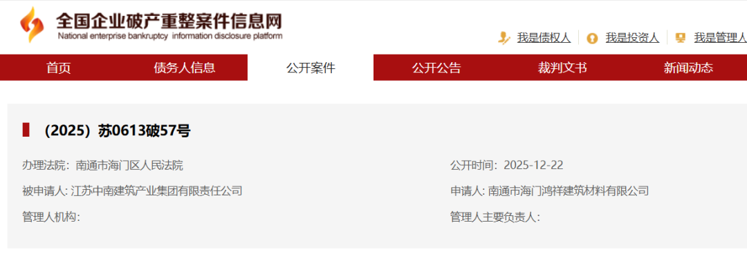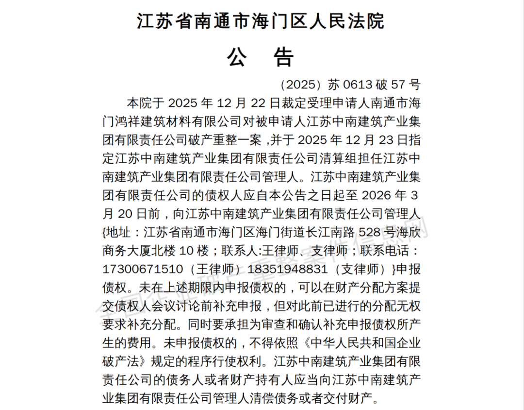 本院于2025年12月22日裁定受理申请人南通市海门鸿祥建筑材料有限公司对被申请人江苏中南建筑产业集团有限责任公司破产重整一案,并于2025年12月23日指定江苏中南建筑产业集团有限责任公司清算组担任江苏中南建筑产业集团有限责任公司管理人。