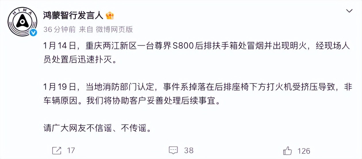 对此,1月19日,鸿蒙智行发言人发文称,1月14日,重庆两江新区一台尊界S800后排扶手箱处冒烟并出现明火,经现场人员处置后迅速扑灭。1月19日,当地消防部门认定,事件系掉落在后排座椅下方打火机受挤压导致,非车辆原因。我们将协助客户妥善处理后续事宜。