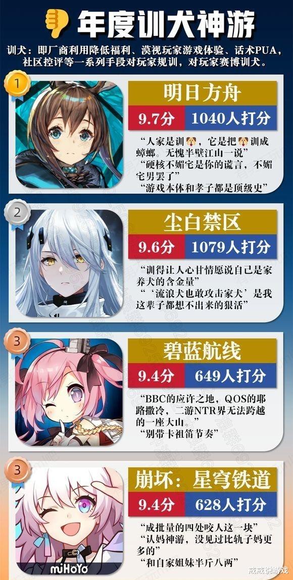 说完了背景,就来看看这些特殊群体玩家排的一些榜单,比如他们评选了二游圈最会调教玩家(利用降低福利、漠视玩家游戏体验,话术pua、社区评控等一系列手段对玩家规训)的游戏,排名前三的是《明日方舟》、《尘白禁区》和《碧蓝航线》,舟游能拿低是因为他们觉得“游戏本体和孝子都是顶级”。