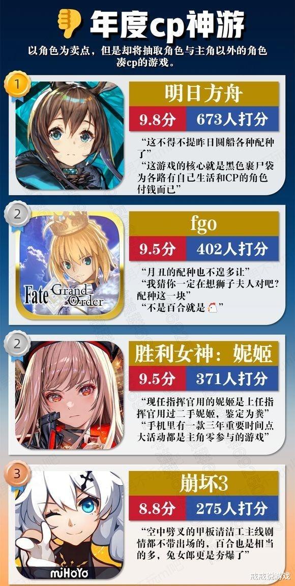 就像戒戒上面说的,这个榜单只是某些特殊群体评出来的,大伙当个乐子看就好了。乍眼一看舟游拿的第一还挺多,比如年度CP神游第一也是《明日方舟》。CP神游的意思是以角色为卖点,但是却将抽取角色与主角意外的角色凑CP的游戏,看榜单的话崩三cp不第一不合理,这位cp乱炖就算了,还是著名的百合乱炖,主打一个眼花缭乱。