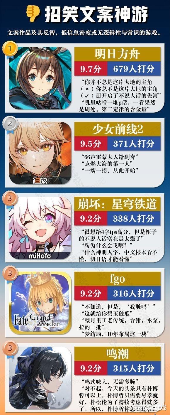 榜单有点多,戒戒也就不一一分享了,最后看一个招笑文案神游的榜单,舟游又是第一哈哈哈!看到最后有鸣潮总算松了一口气,只是这文案选题用的还是24年开服的时候的文案?能不能专业一些。小伙伴们辣仙排的这个榜单有戳中你的笑点吗?来跟大伙分享一下吧!
