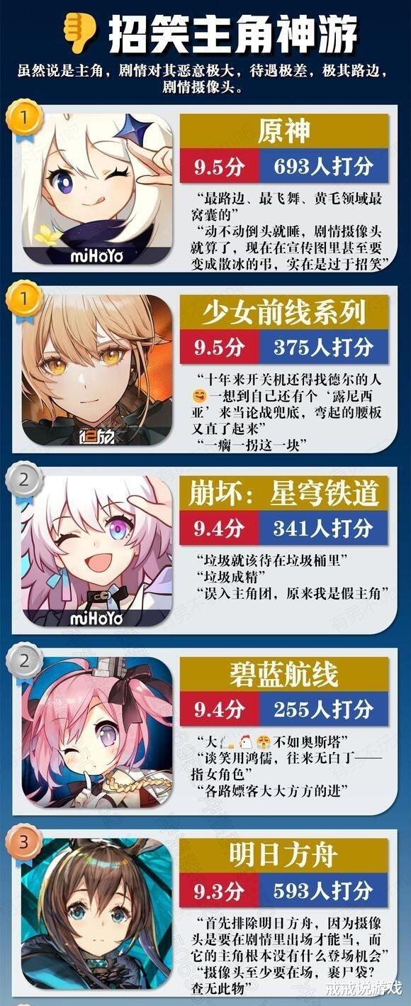从招笑主角这个榜单就可以看出,这个排榜单的人纯云了。就说崩坏第一部的主角琪和第二部的主角寻待遇都不差,这也能上榜?妮姬纯属抛开设定瞎想了,粥和崩三才该是第一,相比之下原还算好的了,至少主角跟角色关系还是很好的。