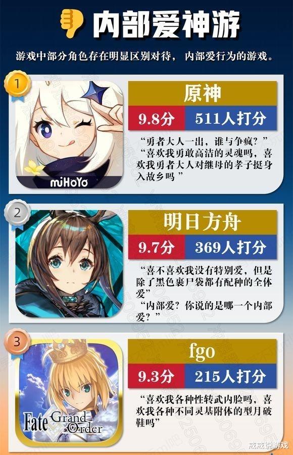 内部爱前三都是大佬,原神、明日方舟和FGO,舟游确实有些内部爱恨的,最大的原因可能还是游戏是画师先创造人物然后随便拉cp,文案在后面擦屁股编故事,和其他游戏是反过来的。同样的FGO也是把内部爱写脸上了,最典型的就是武藏和梅芙这俩角色。