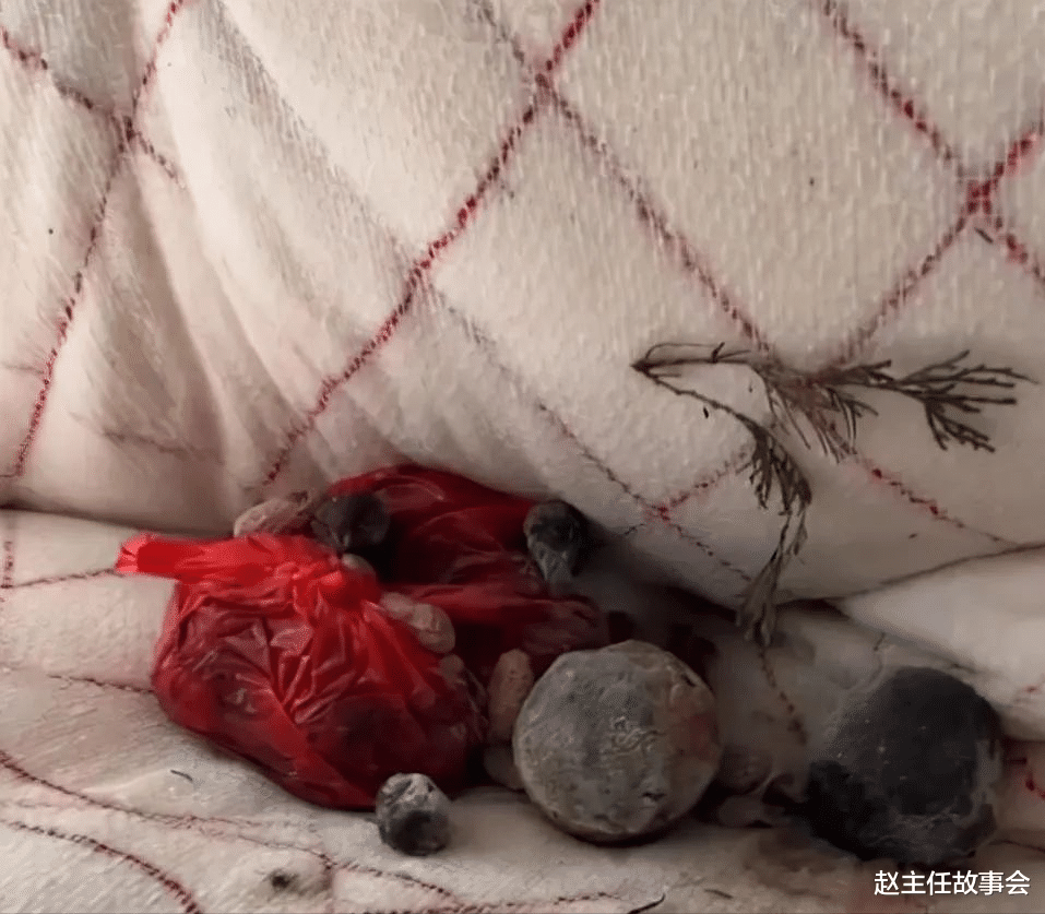 她打开之后,这个被子里都烂了,里面有几个栗子和枣子。