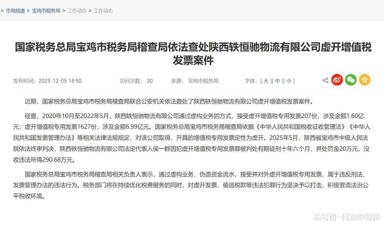经查,2020年10月至2022年5月,陕西轶恒驰物流有限公司通过虚构业务的方式,接受虚开增值税专用发票207份,涉及金额1.60亿元;虚开增值税专用发票1627份,涉及金额6.99亿元。国家税务总局宝鸡市税务局稽查局依据《中华人民共和国税收征收管理法》《中华人民共和国发票管理办法》等相关法律法规规定,对该公司取得、开具的增值税专用发票定性为虚开。2025年5月,陕西省宝鸡市中级人民法院依法终审判决,陕西轶恒驰物流有限公司法定代表人侯一群因犯虚开增值税专用发票罪被判处有期徒刑十年六个月,并处罚金20万元,没收违法所得290.68万元。