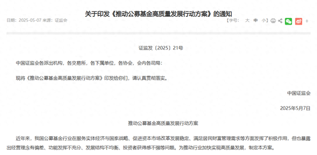 红星资本局5月8日消息,业绩明显低于比较基准的须少收管理费、三年以上产品业绩低于比较基准超过10个百分点的基金经理绩效薪酬应下降、扭转基金公司“旱涝保收”现象……5月7日,证监会发布实施《推动公募基金高质量发展行动方案》(下称“《方案》”),通过25条举措直击行业痛点。