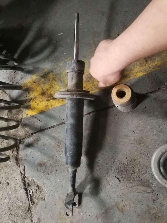 在拆下减震器以后发现,把减震器摁到底根本不会反弹,所以问题也就找见了,和车主沟通更换左右减震器,虽然是右边的减震器损坏,但是为了车身的高低问题和减震使用的时间,就算这次不换左边的减震器,也使用不了多久,所以左右一起更换。