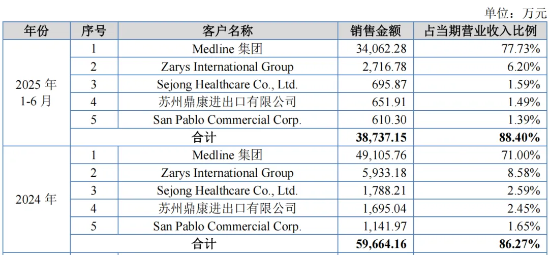 招股书显示,报告期内,爱舍伦对前五大客户的销售收入占比均超过80%,其中对Medline集团的销售占比更是高达70%以上。