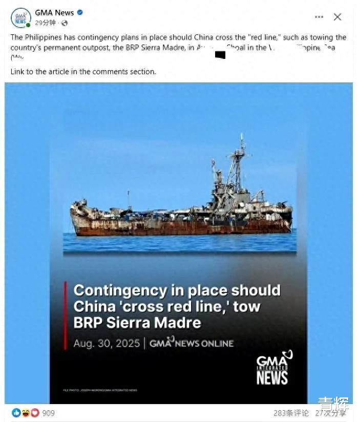 8月30号这一天,菲律宾媒体对外公布了此前一直炒作的所谓的在仁爱礁的红线。