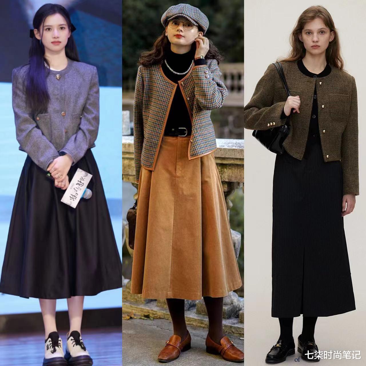 张婧仪用小香风外套搭配黑色伞裙,知性沉稳中透着几分活泼俏皮。纯色小香风不挑人,更百搭,另外也可以搭配中性风的乐福鞋,来弱化小香风的隆重感。