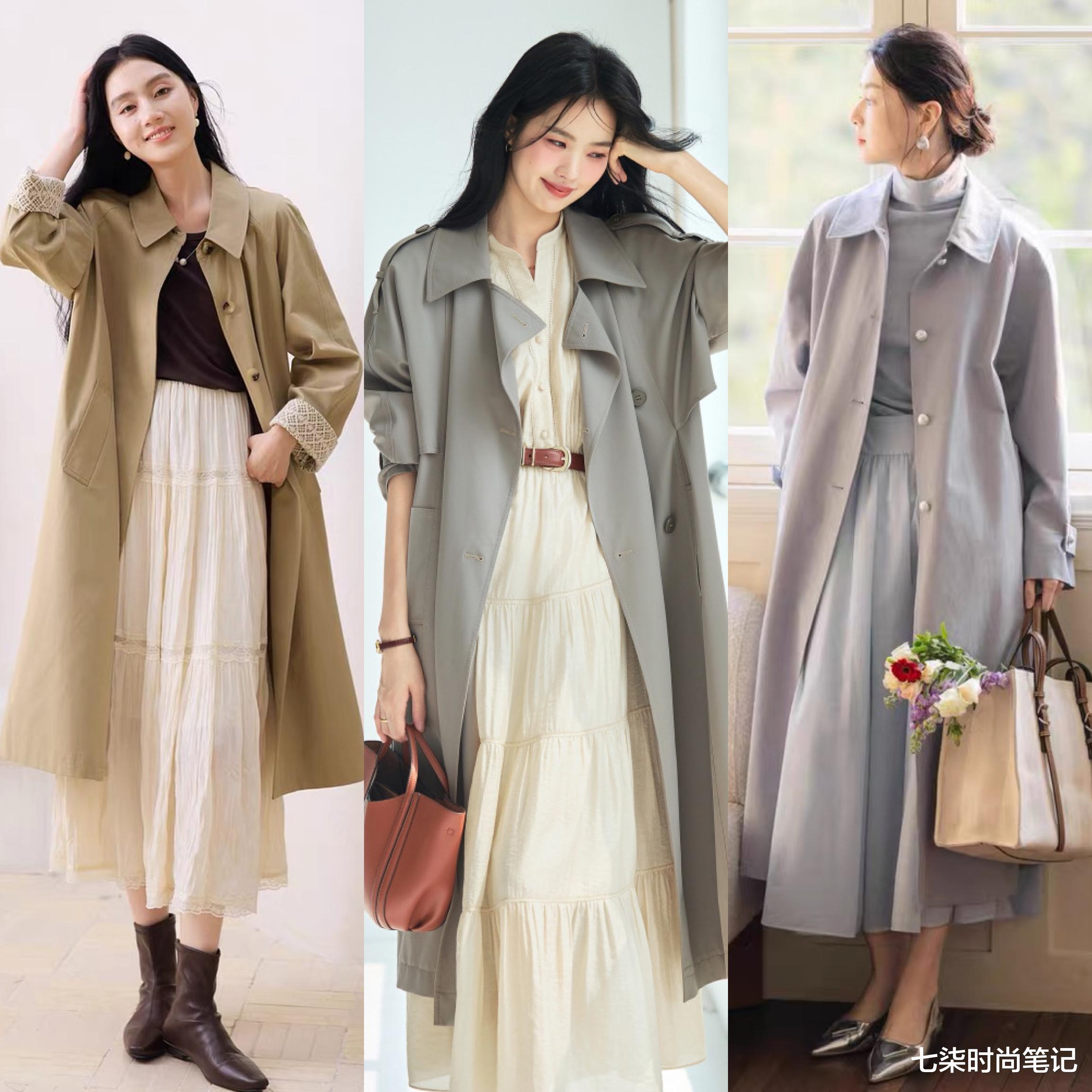 裙摆比风衣略长几分,露出一点边角,整体更有层次。若是想要更简洁清爽,裙长露出脚踝最好。小个子女生可以内搭短上衣和高腰半裙,通过上下撞色着重强调出腰线,也能穿出气场。
