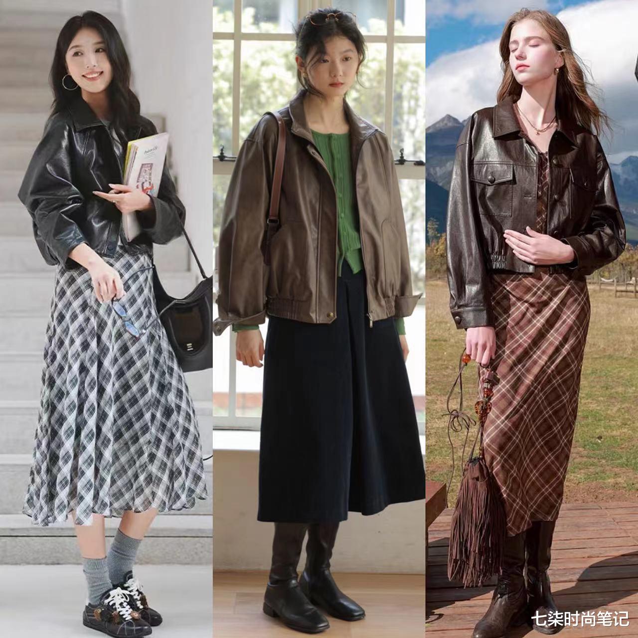 今年秋天时髦精们也喜欢用酷酷的皮衣搭配格纹半裙,可以轻松营造出慵懒时髦的复古氛围。在颜色搭配方面,很推荐皮衣与长裙同色,整体和谐统一,尽显高级质感。