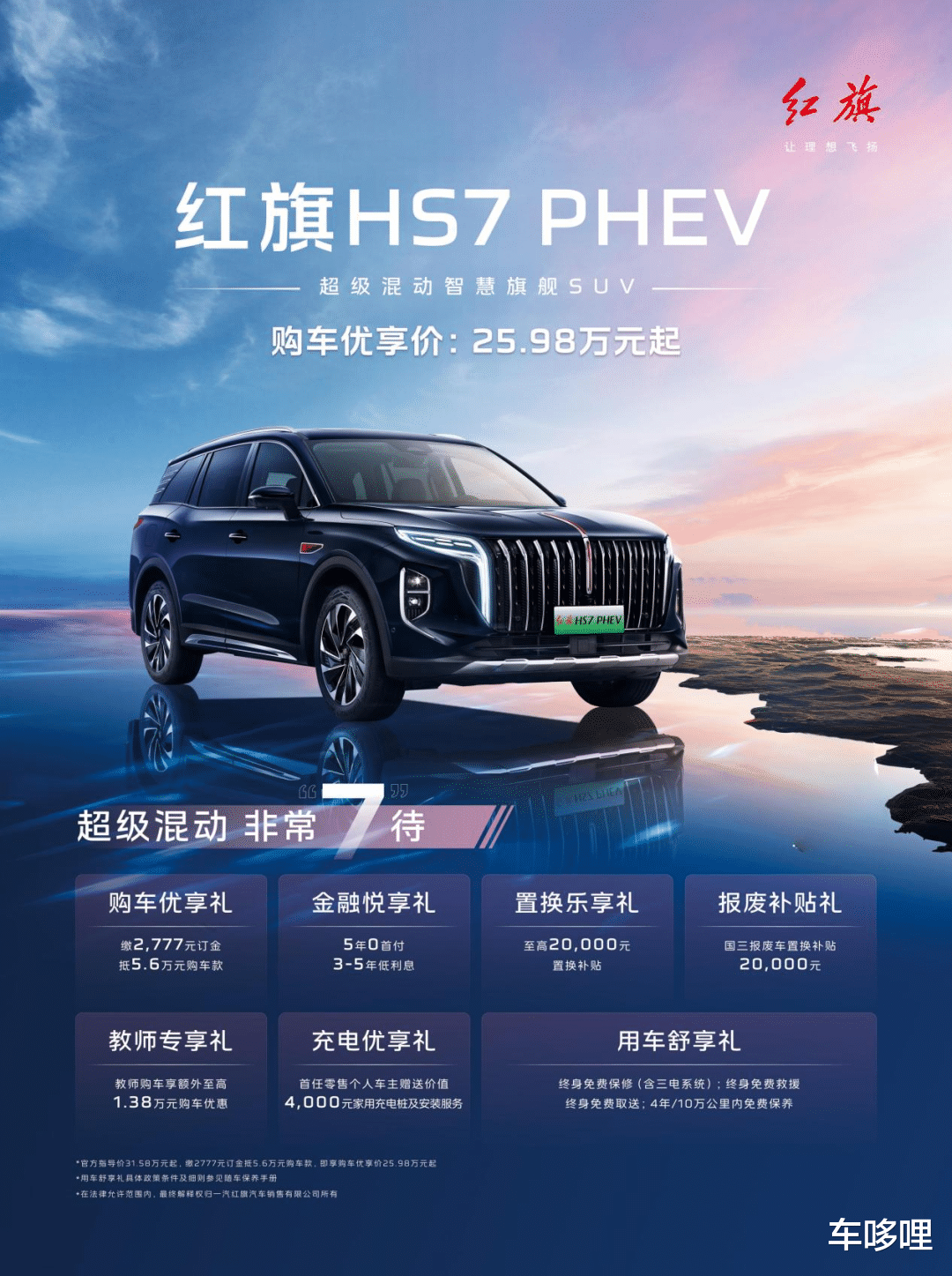 总的看下来,我们可以发现,无论是堪称标杆级的超级混动系统,全方位守护的安全,还是丰富的智能配置,舒适的空间,都使得红旗HS7 PHEV在25万级混动SUV市场中竞争力十足。加之目前红旗HS7 PHEV还可以享受2777元订金享25.98万元起的惊喜价购车,此外还可享5年0首付金融礼、置换/报废补贴最高享4万元、三电系统终身免费保养等诸多购车礼遇,这些权益和政策无疑进一步提升了红旗HS7 PHEV的性价比。