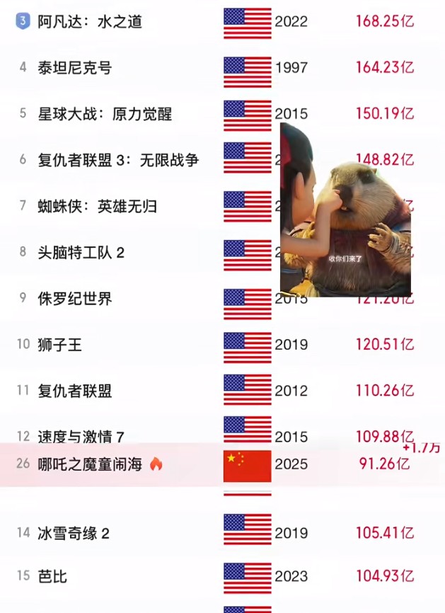 而《哪吒2》是全球电影票房榜前20,唯一的一部“非好莱坞”电影!