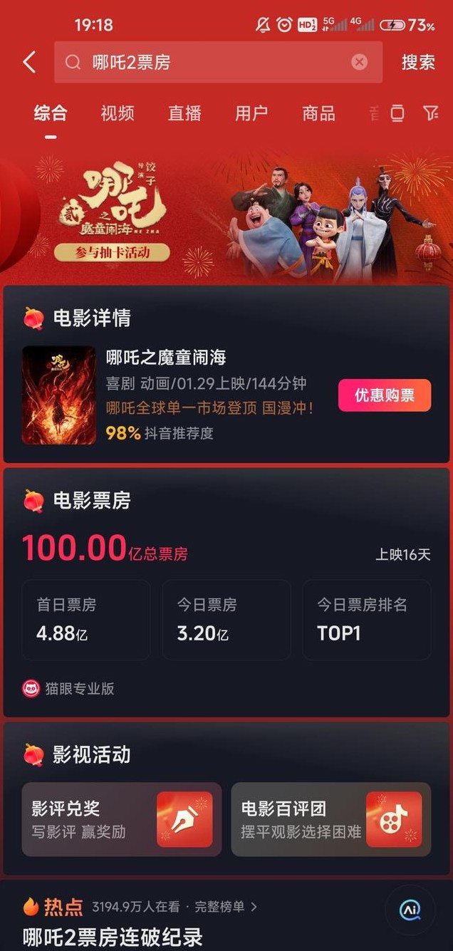 一开始猫眼预测哪吒票房50亿上下,没想到直接给翻了个倍!