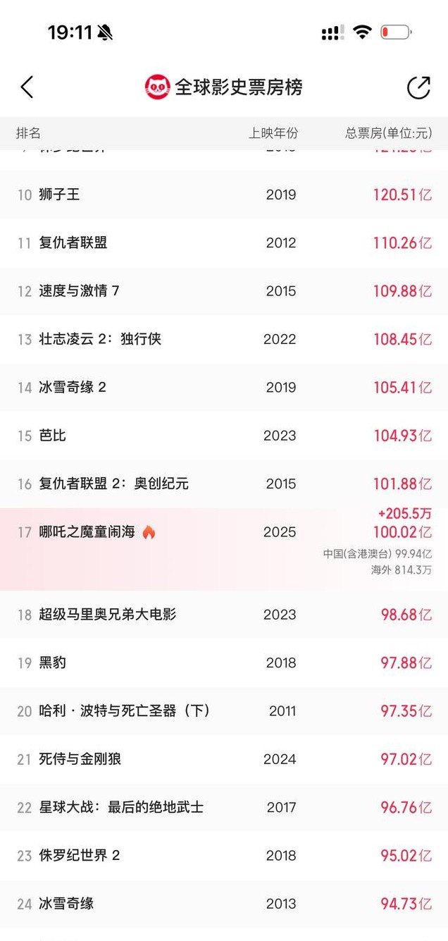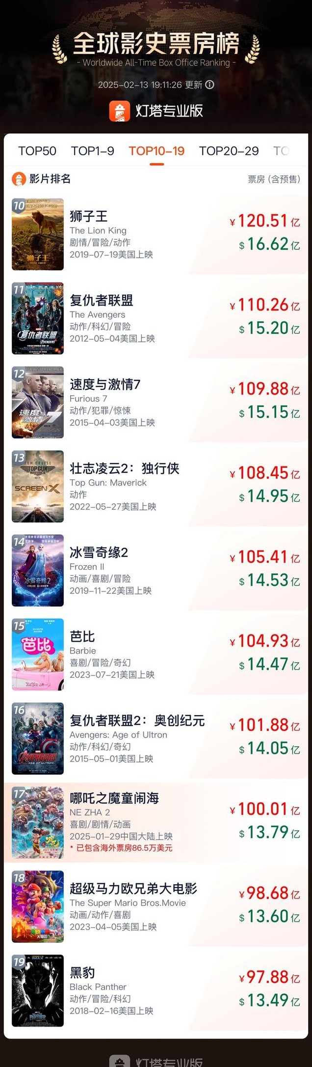 《哪吒2》上映短短数天,直接进入全球票房榜top前20!