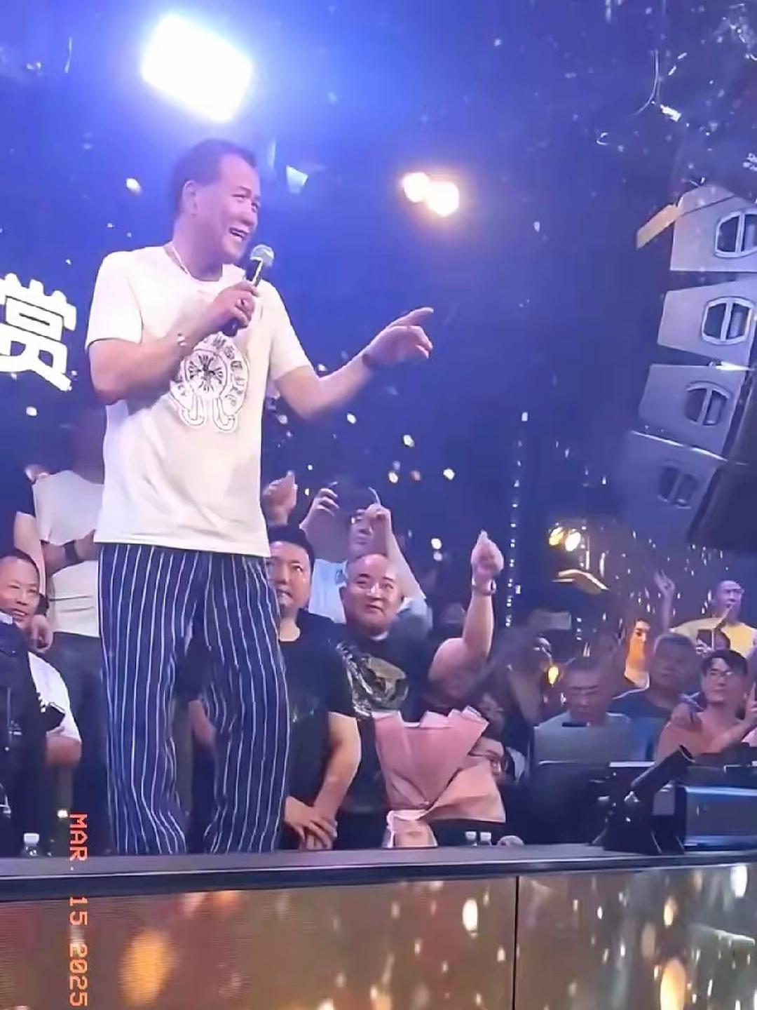舞台上,一位身材发福、发际线后移的老者,正费力地握着麦克风嘶吼着《友情岁月》。他身上那件亮片西装在霓虹灯下折射出一种近乎心酸的廉价感,与台下稀稀拉拉的观众、甚至只顾低头刷手机的看客,构成了某种荒诞的对比。