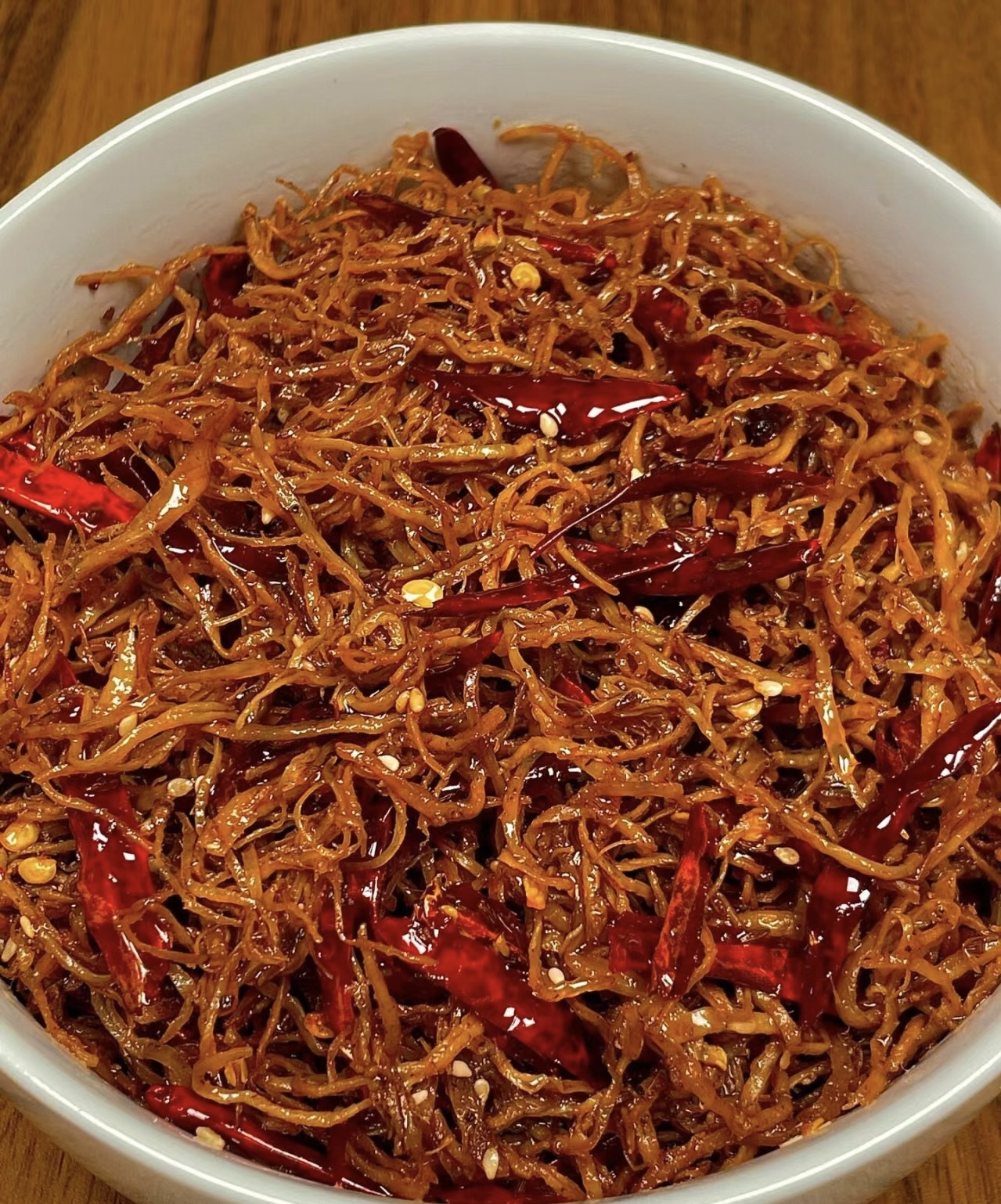 现在,你的麻辣鸡丝小零食就制作完成了!你可以直接将其作为菜品食用,也可以将其作为零食冷吃。无论是哪种方式,都能让你感受到那股独特的麻辣味道,让你欲罢不能!